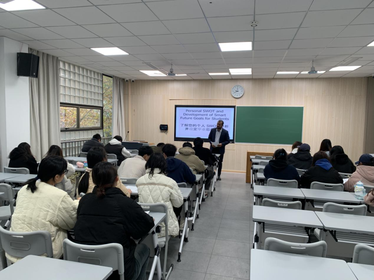 12月13日上午,英国威廉集团官网邀请外教Hazem Ahmed Ragab Ali博士在春晗楼302为在校师生开展了一场题为“员工个人分析与职业规划”的英文主题讲座。