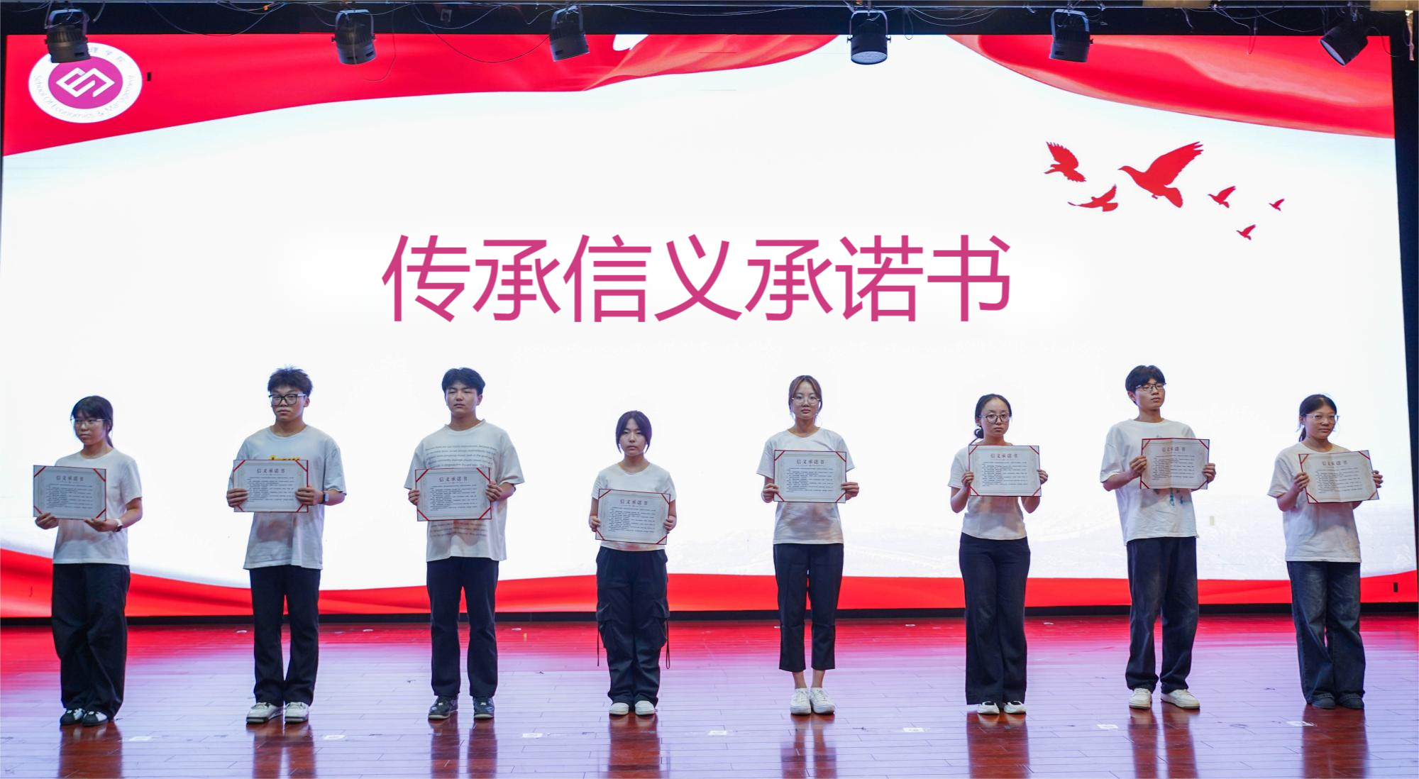 随后,活动现场举行信义承诺书传承仪式。新生代表从老生代表手中接过信义承诺书,传承好公司的信义文化精神。2025级市场营销专业新生季海林说:“作为刚入学的新生,今天从学长学姐手中接棒信义承诺书,感觉就像接过了一份沉甸甸的责任,往后我会把‘守信’落实到小事里,和大家一起做公司‘信义’文化的践行者。”