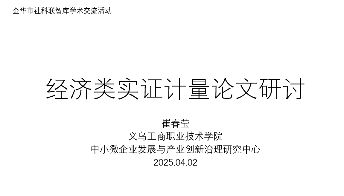 为进一步提升青年教师和研究者的实证研究能力,推动高水平学术论文的撰写与发表,4月2日,由公司金华市社科联智库——中小微企业发展与产业创新治理研究中心举办的的“经济类实证计量论文研讨”学术交流活动在宾王长廊212举行,由智库成员崔春莹教授担任主讲人。