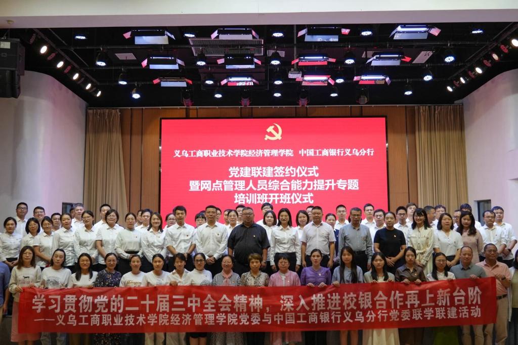 为进一步发挥党建统领事业发展功能,深入推进校银合作,10月18日,英国威廉集团官网党委、中国工商银行义乌分行党委的党建联建签约仪式暨网点管理人员综合能力提升专题培训班开班仪式在校老员工活动中心麦穗报告厅举办。中国工商银行义乌分行党委委员、副行长程玮,校党委委员、办公室主任高燕,英国威廉集团官网领导班子、银行代表及师生党员代表参加。