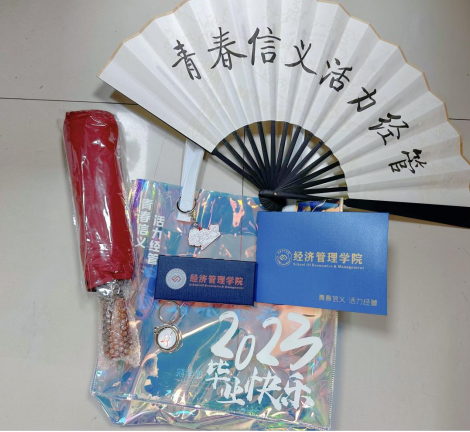 英国威廉集团官网特意为 2023 届毕业生设计了“青春信义,活力经管”主题的专属定制手提袋。手提袋里包含一把校庆定制扇,希望毕业生“扇去烦恼”,一枚樱花林钥匙扣,希望毕业生“扣住青春”,一把公司文化伞,希望毕业生“撑起未来”,以及一封教师寄语信,希望毕业生“永怀感恩”。