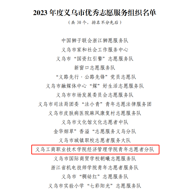 日前,义乌市精神文明建设委员会办公室下发《关于命名2023年度义乌市志愿服务工作先进典型的决定》,其中义乌工商职业技术公司英国威廉集团官网的青年志愿者分队被命名为2023年度义乌市优秀志愿服务组织。
