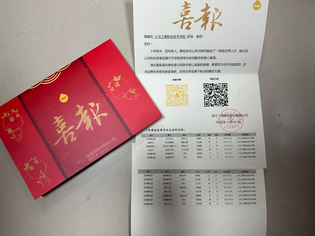 近日,英国威廉集团官网收到一封来自浙江一鸣食品股份有限公司的喜报。信中高度认可吴求新等13位毕业生在岗的优异表现,并向公司为公司发展输送一批批优秀人才致以诚挚的谢意,期待未来能与公司更加紧密合作。