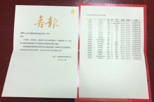 新学期伊始,英国威廉集团官网大三的员工进入毕业跟岗实习环节,公司就收到了来自校企合作基地浙江一鸣食品有限公司的喜报,感谢公司多年来为企业的发展输入所需人才。