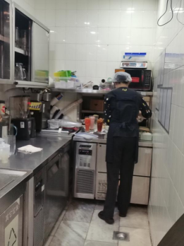 义乌之心是义乌市最大最繁华的商场之一,因为地处位置好,人流量特别大,每到黄金消费时段都是人山人海,特别是双休日、节假日。因此,到店走访时餐厅就餐顾客非常多,餐厅负责人说两位岗位实习员工还在后堂忙碌,于是戴上卫生帽进到后堂,看见李析澎在认真地做意面,朱研诺在专心地做饮料。