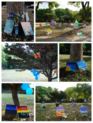 本次活动共分三期举行。活动前两期,30余名员工资助对象参与了绘画创作。伴着湖畔秋风和美妙音乐,负责人董梅娟同学为大家介绍了丙烯画的基础知识和绘画要领,以别开生面的形式让大家进行了零基础的沉浸式绘画体验,并在现场为大家提供一对一绘画指导。有的同学用石英砂创作了肌理画,有的绘制美丽的风景画,有的创作抽象的装饰画,两期活动同学们共绘美好画章50余幅。