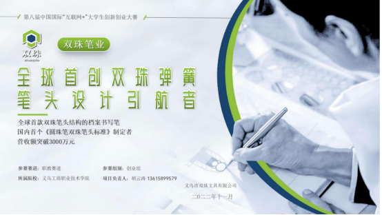 双珠笔业项目是适用于高端圆珠笔头设计与生产企业的创新项目,将双珠笔头应用于档案书写笔领域并实现规模化量产。项目创始人和团队成员携手并肩,用知识和灵感点亮创新创业思维,用科技和智慧开拓创新创业项目,在“互联网+”大赛全国总决赛的舞台上,以饱满的热情和专业的陈述,向评委精彩展示创新创业成果,展现经管学子敢闯会创的精神风貌。