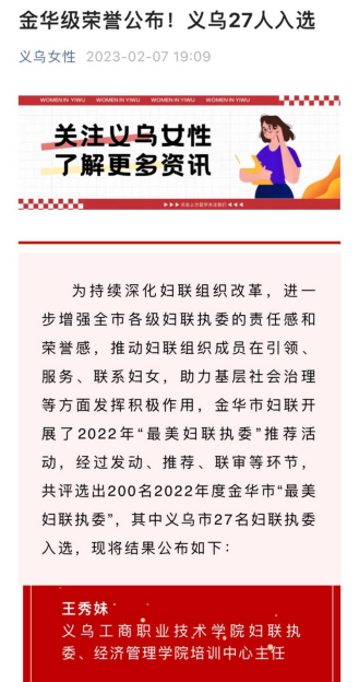2月7日,金华市妇联开展的2022年“最美妇联执委”推荐活动的评选结果揭晓,活动一共评选出200名2022年度金华市“最美妇联执委”,义乌市27名妇联执委入选,其中公司王秀妹老师获评此荣誉。