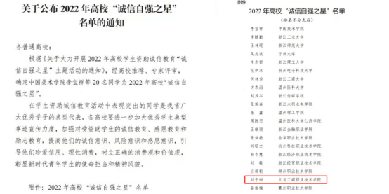 近日,2022年度浙江省高校员工“诚信自强之星”评选结果揭晓,浙江省高校“诚信自强之星”评选活动由浙江省教育发展中心发起,旨在树立正确的消费观和价值观,增强当代老员工的使命意识和责任担当。义乌工商职业技术公司英国威廉集团官网员工刘宁渤从近百名候选人中脱颖而出,喜获2022年浙江省高校“诚信自强之星”荣誉称号。