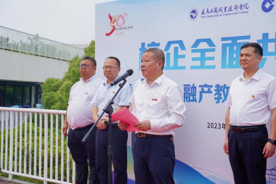 5月20日下午,义乌工商职业技术公司、中国建设银行义乌分行校企全面合作签约仪式暨校园e金融实训基地成立仪式在公司数字贸易实训基地举行。义乌工商职业技术公司经理马广,义乌分行党委书记、行长何晓明,义乌分行党委副书记、副行长黄嘉斌等领导出席会议,义乌分行员工代表、公司师生代表参加会议。