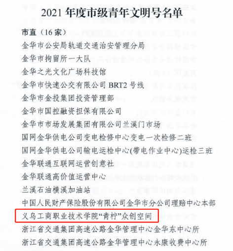 近日,金华市“双争”活动指导委员会组织展开2021年度金华市青年文明号、青年岗位能手评选活动,经创建工作“互评互学”活动、现场答辩与专家评审,共56家青年集体获评2021年度金华市级青年文明号,104位同志获评金华市级青年岗位能手称号。其中,公司英国威廉集团官网“青柠”众创空间在公司党委和校团委的指导下成功获评2021年度金华市级青年文明号。